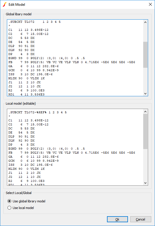 All parts selected using the model library browser as described above are defined using a model located in the global model library. You can view this model using the right click popup menu View/Edit Model... . This will display something like the following dialog box: The top half of the above box shows the definition of the model in the library. The bottom half shows an editable local copy of the model. To begin with, this will be exactly the same as the library model shown in the top half. But you may edit this as desired (but note you should not edit the top line starting .subckt or bottom line .ends). This model will then be used instead of the global library model if you select the check box at the bottom: Use local model.
