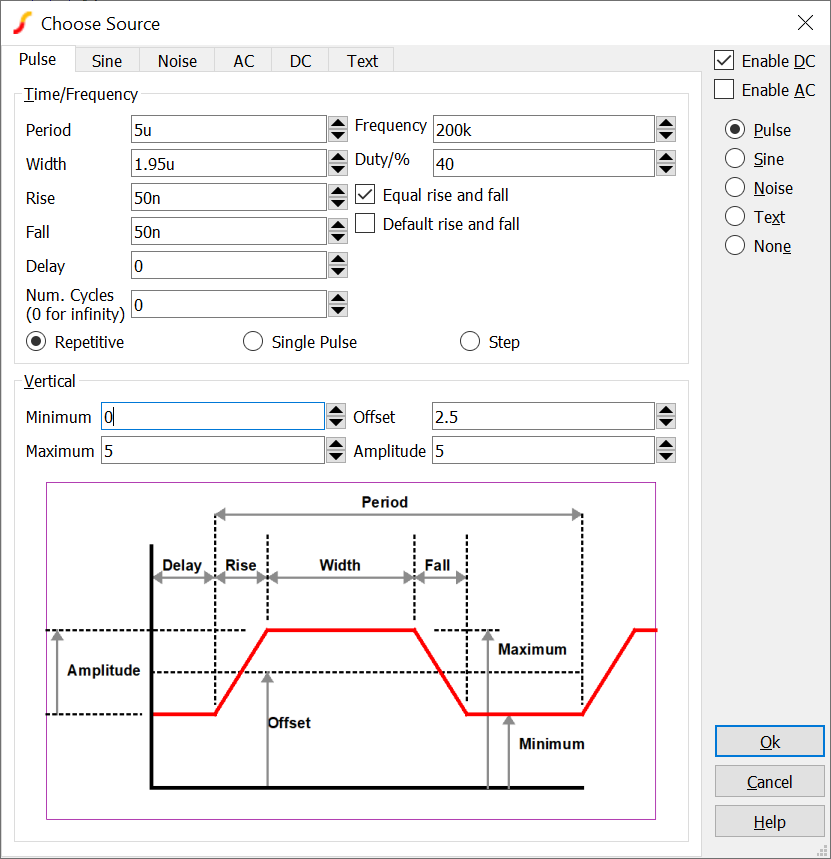 5. Double click V2. Edit the settings as shown below: This sets up a 200kHz 5V pulse source with 40% duty cycle and 50nS rise time.