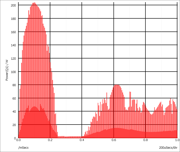 This shows a peak power dissipation of 200W although you are probably more interested in the average power dissipation over a specified time. To display the average power dissipation over the analysis period: