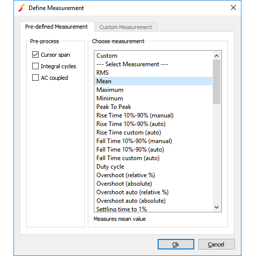 In the right hand pane labelled Choose Measurement select Mean. In the Pre-process group, select Cursor span. Click Ok to close the dialog box.