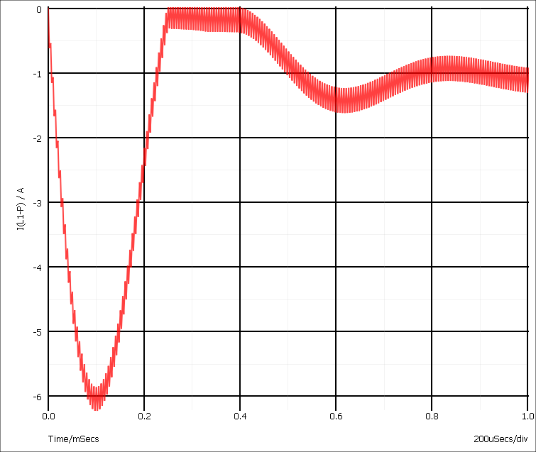 This shows that the operating current is less than 1.5A but peaks at over 6A. In practice you would want to use an inductor with a maximum current of around 2A in this application; an inductor with a 6A rating would not be cost-effective. We will now replace the ideal part, with something closer to a real inductor.