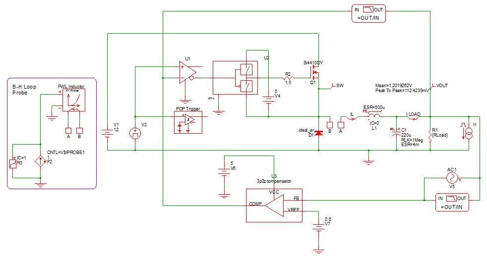 Each schematic is set up to first find the steady-state Periodic Operating Point of the system. It will then perform an AC analysis to find the Bode Plot of control loop of the full nonlinear time-domain switching system. Finally, it will perform a step-load transient. The approximate simulation times for each circuit are shown beside each link. The first number is the time to find the steady state Periodic Operating Point of the system, the second time is the time to perform the AC analysis, and the third time is that required for the time-domain step-load transient.